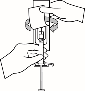 4. Наполовину откройте упаковку безопасной иглы. Возьмитесь за колпачок иглы с помощью пластикового мешочка. Держите шприц вверх. Прикрепите безопасную иглу к шприцу легкими вращательными движениями, чтобы избежать трещин или повреждений втулки иглы. Перед введением всегда проверяйте наличие признаков повреждения или утечки.