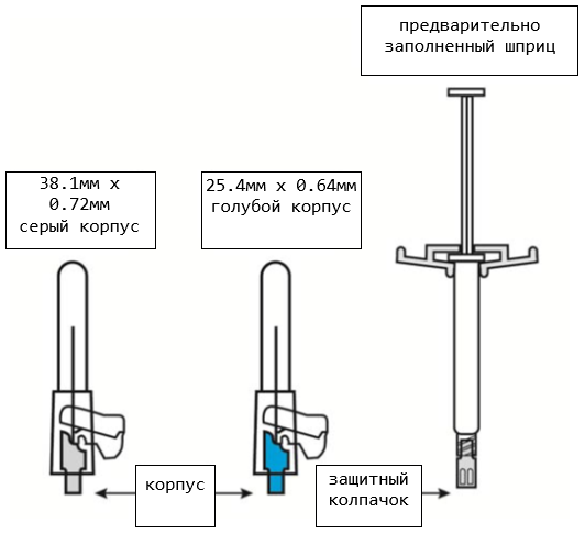 Для введения в ДЕЛЬТОВИДНУЮ мышцу пациентам с массой тела <90 кг используют иглу размером 1 дюйма, 23 G (25.4 мм x 0.64 мм) (с голубым корпусом); пациентам с массой тела ≥90 кг используют иглу размером 1½ дюйма, 22 G (38.1 мм x 0.72 мм) (с серым корпусом).