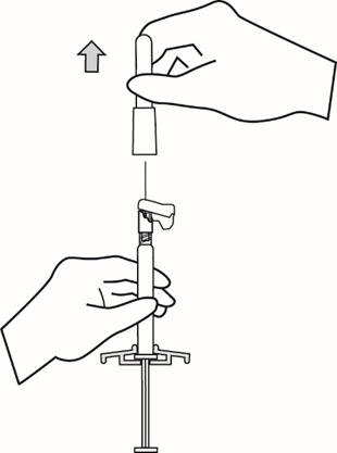5. Снимите с иглы колпачок, потянув его вдоль иглы. Не вращайте колпачок, так как это может ослабить соединение иглы со шприцем.
