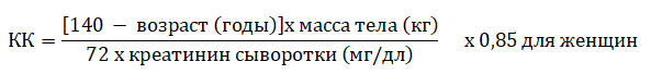 Таким пациентам необходима индивидуальная коррекция дозы, в зависимости от функции почек, в соответствии с нижеприведенной таблицей. Для использования таблицы необходимо определить значение клиренса креатинина (КК мл/мин), которое определяется, исходя из концентрации креатинина в сыворотке (мг/100 мл) по следующей формуле: