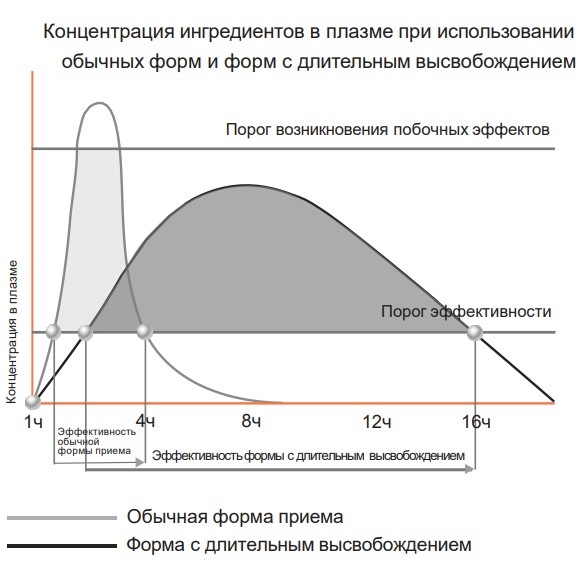 Некоторые ингредиенты могут раздражать пищеварительный тракт. Капсулы с длительным высвобождением позволяют избежать контакт активных ингредиентов со слизистой желудка и, в результате, уменьшить риск возникновения побочных эффектов.