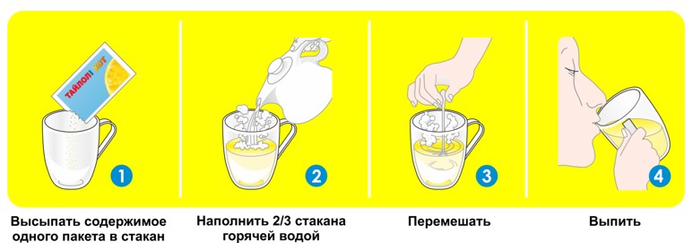 Ингредиент каждого пакета следует растворить в 160 мл горячей воды (примерно одна чашка стандартного размера) и немедленно выпить.